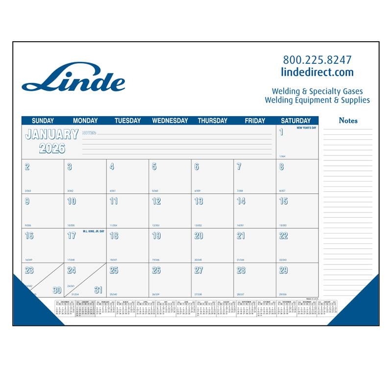 These attractive 22″ x 17″ calendars feature appointment pad with convenient memo blocks and a large imprint area for your name and contact information, dark blue corner leatherette protective corner pockets are included.